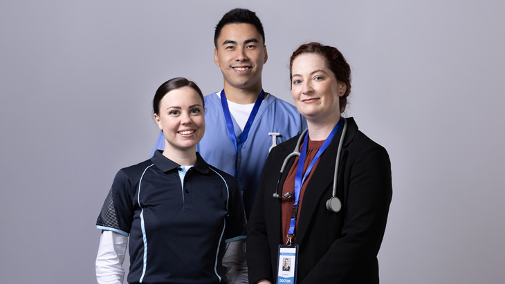 Cam’s health providers walk into the scene, his GP, Physio, and nurse. They say hi to Cam and check how he’s doing. They all stand in the row behind Cam.