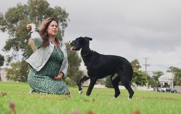 Close up shot of Monty, Nikki’s dog, then back again waking Monty and throwing a ball for Monty at the park.
