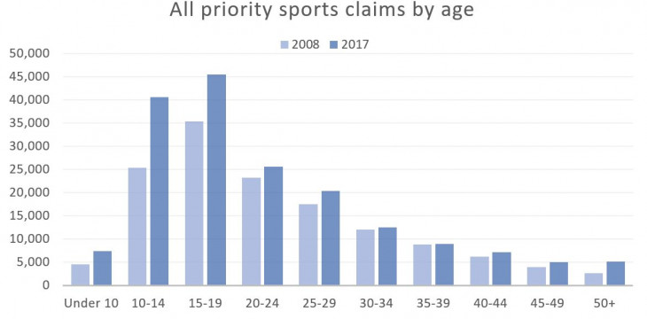 Changes in injury volume between 2008 and 2017 by age group across priority sports (rugby union, soccer, netball basketball, rugby league, gymnastics, touch rugby)